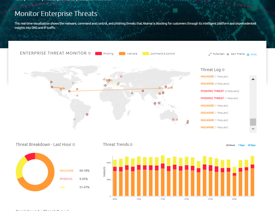 This real-time visualization shows the malware, command and control, and phishing threats that Akamai is blocking for customers through its intelligent platform and insights into DNS and IP traffic.