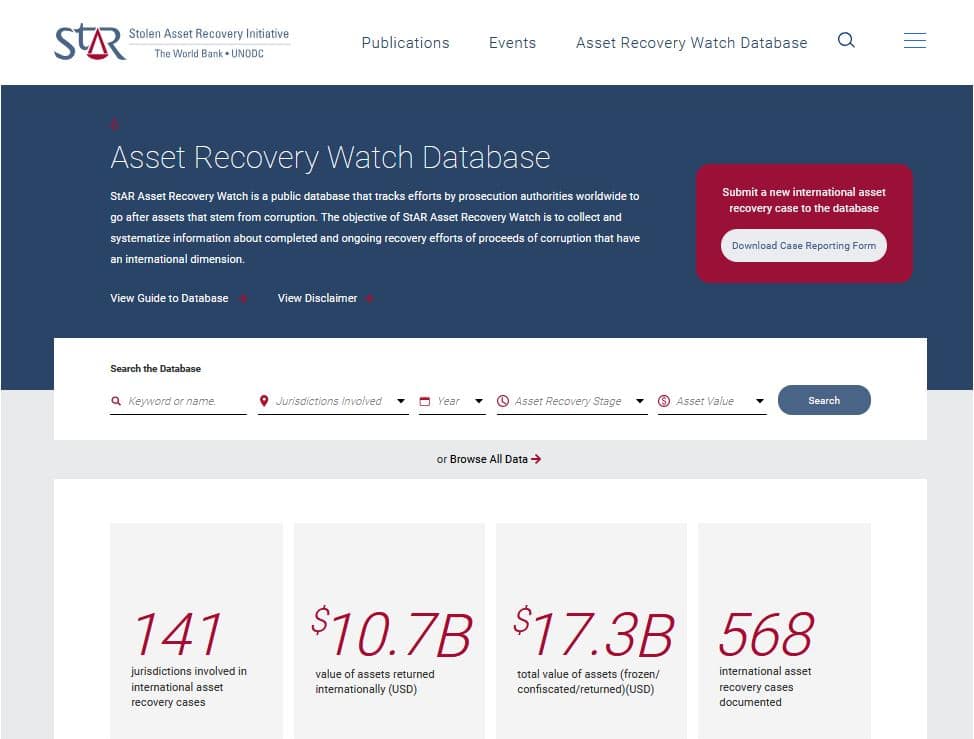 StAR Asset Recovery Watch is a public database that tracks efforts by prosecution authorities worldwide to go after assets that stem from corruption.