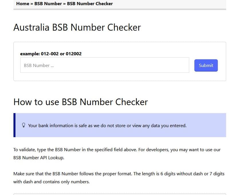 The Australia BSB Number tool checks the validity of the code based on the complete database of more than 14,000 unique BSB numbers.