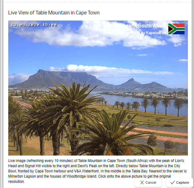 Live Webcams April 13, 2020 70 0 Cape Town Webcam Live view of Table Mountain in Cape Town. live webcams Visit website Share Twitter Facebook Pinterest Email
