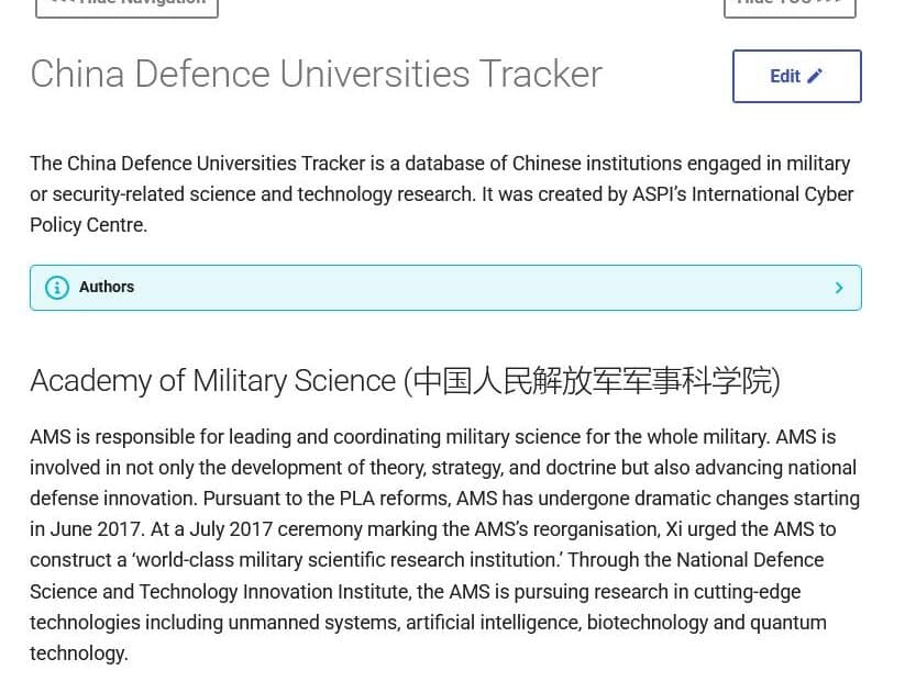 The China Defence Universities Tracker is a database of Chinese institutions engaged in military or security-related science and technology research. It was created by ASPI’s International Cyber Policy Centre.