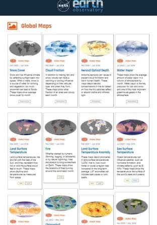 Global maps by The Earth Observatory, NASA. See images, stories, and discoveries about the environment, Earth systems, and climate that emerge from NASA research, including its satellite missions, in-the-field research, and models.