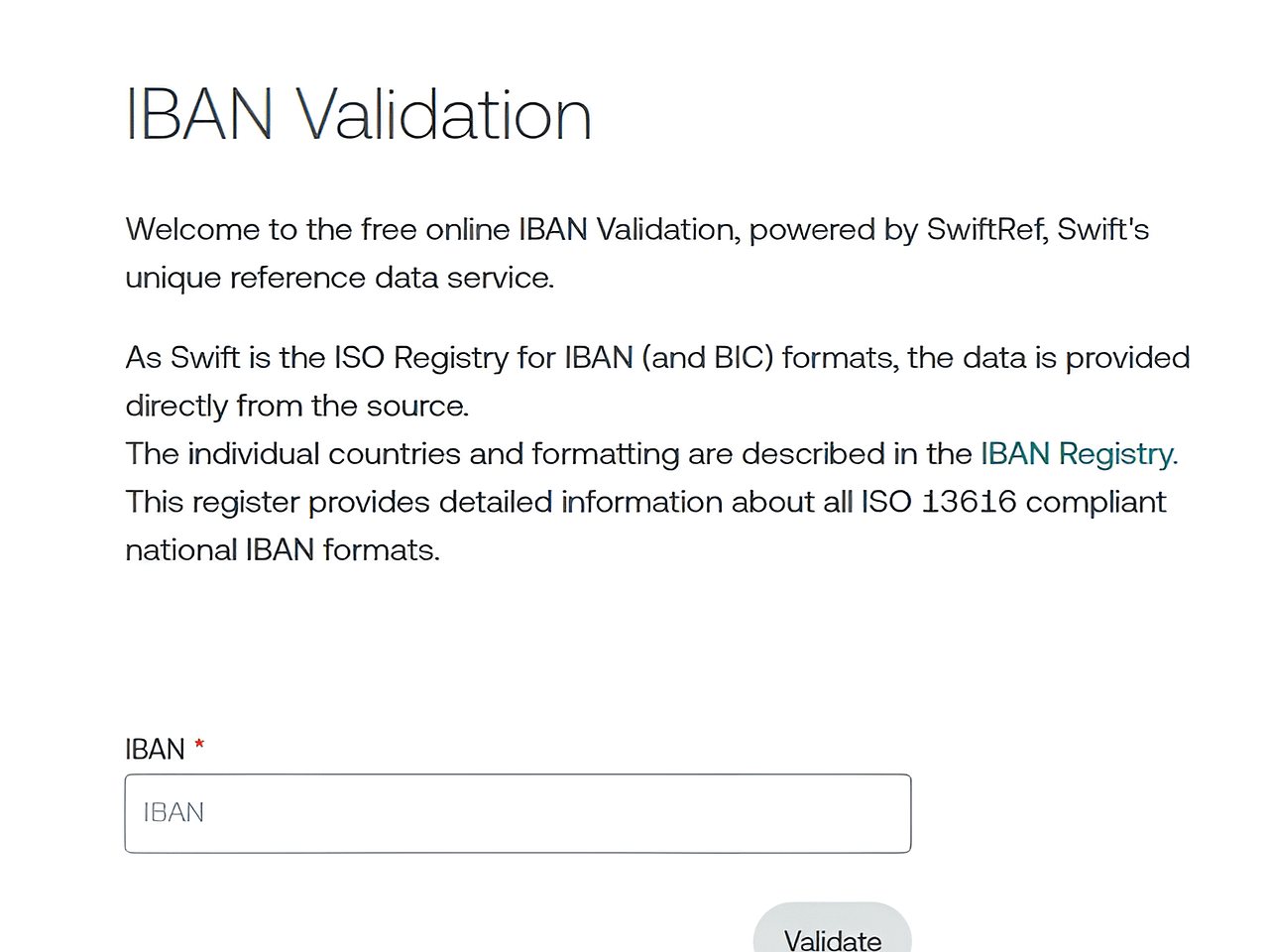 Free online IBAN Validation, powered by SwiftRef, Swift's unique reference data service. As Swift is the ISO Registry for IBAN (and BIC) formats, the data is provided directly from the source.