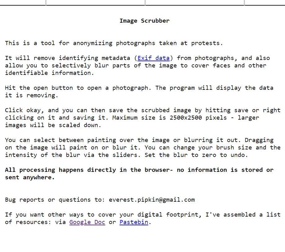 Tool for anonimizing photographs taken at protests by removing identifying metadata (Exif data) from photographs. You can also blur parts of the image to cover faces and other identifiable information. All processing happens directly in the browser, no information is stored or sent anywhere.