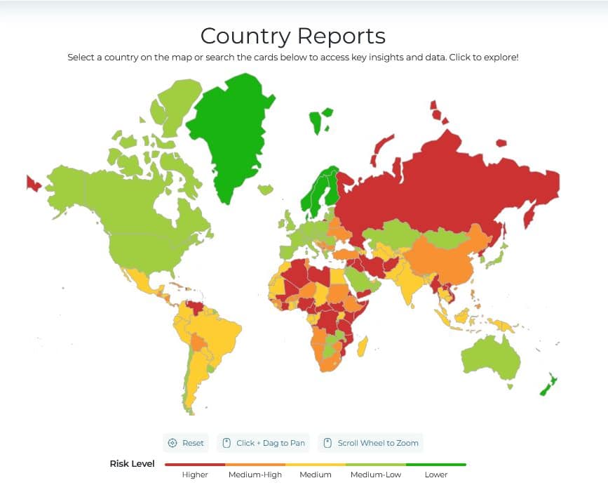 A publicly accessible country overview for 240+ jurisdictions capturing AML/CFT risk, sanctions, human trafficking, crime, free trade zones, methodologies, and more.