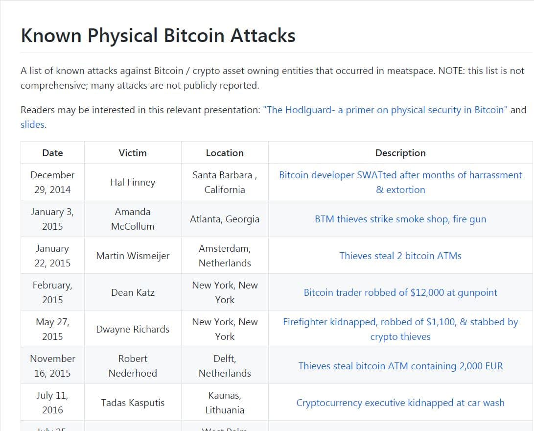 A list of known attacks against Bitcoin / crypto asset owners compiled by Jameson Lopp.