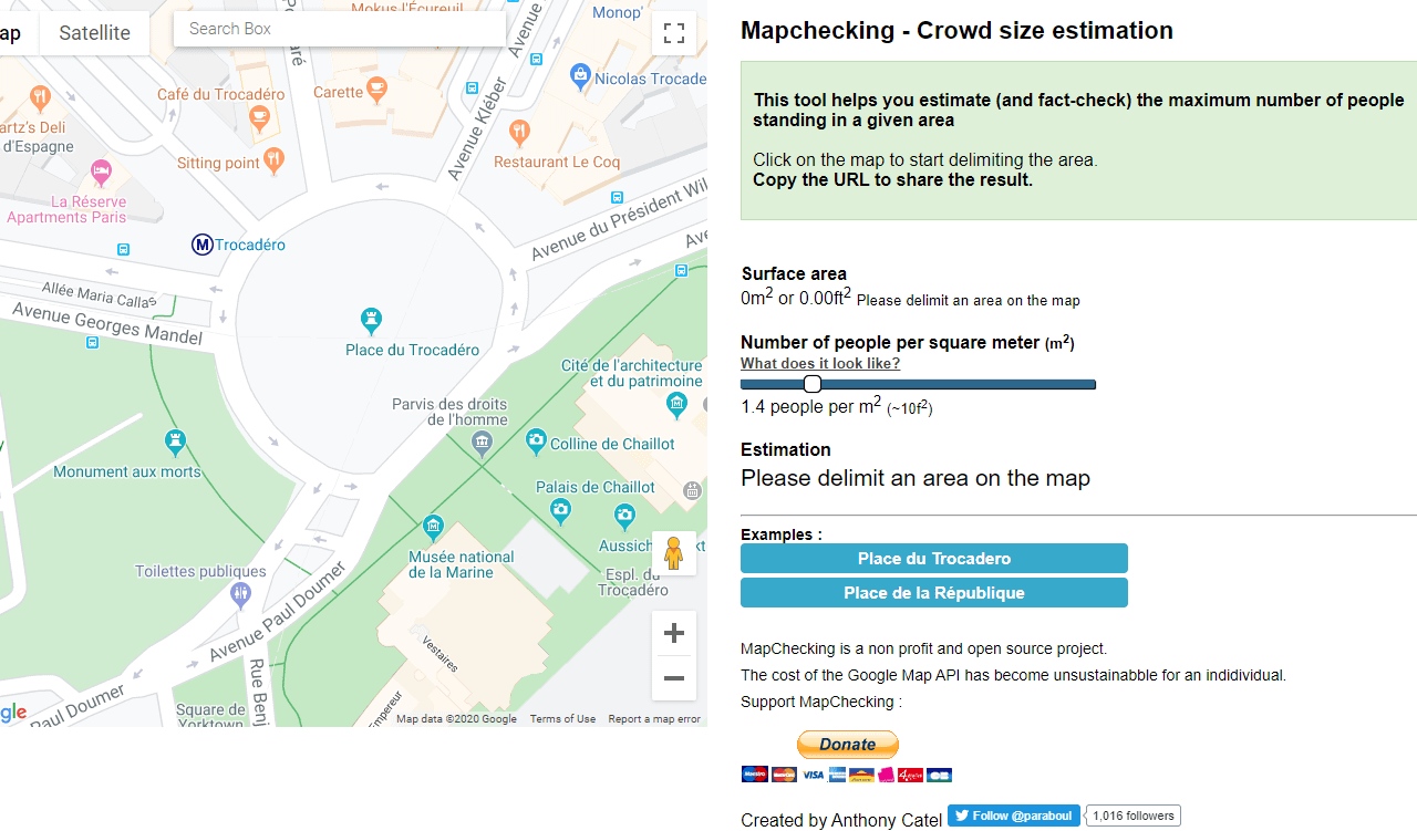 This crowd size estimation map helps you estimate and fact-check the maximum number of people standing in a given area. Created by Anthony Catel.