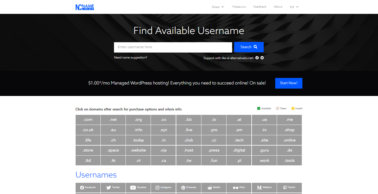 This free search tool allows you to check social media username availability over many social networks as well as domain name availability.