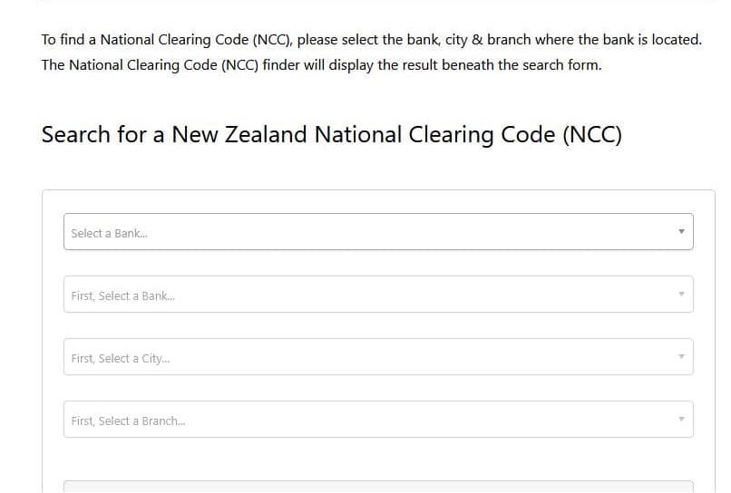 New Zealand National Clearing Code (NCC) search & finder tool.