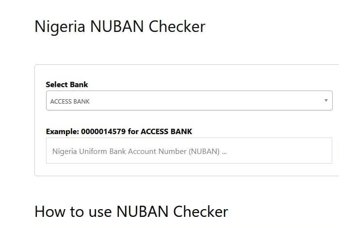 The NUBAN look-up tool checks the validity of a Nigeria Uniform Bank Account Number (NUBAN) based on mathematical calculation.
