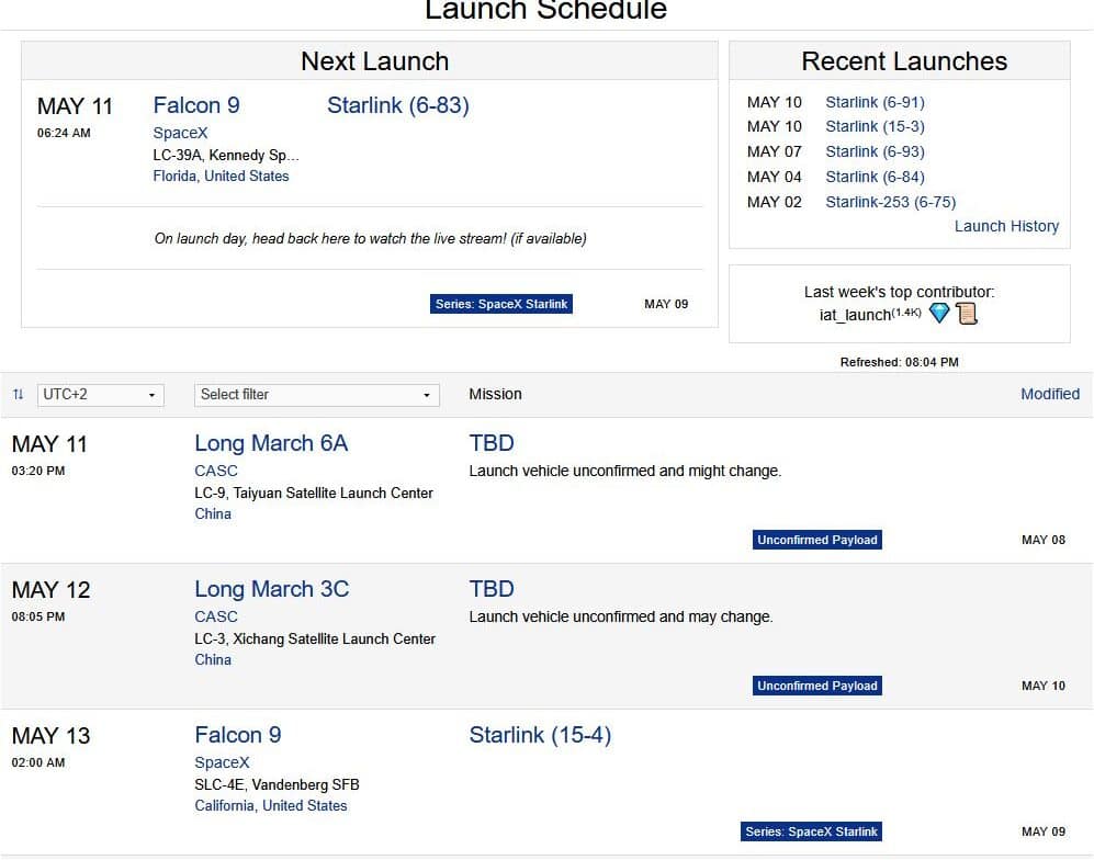 Real-time launch calendar and data (providers, payloads, launch sites).