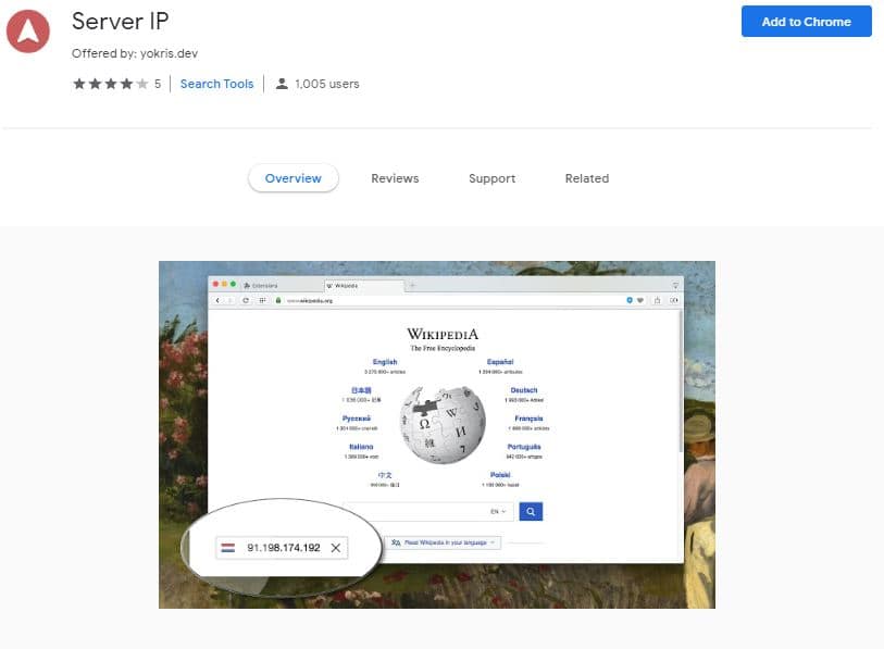 Server IP adds a small popup box that displays a country flag depicting the location of the current website's server and provides a multitude of tools such as WHOIS, geolocation and domain information on click.