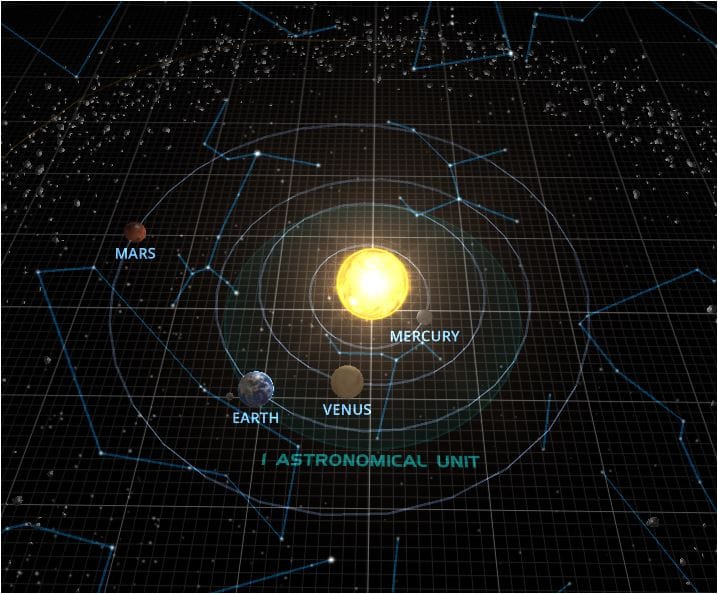 An interactive 3D model of the solar system and night sky, with real-time celestial body positions.