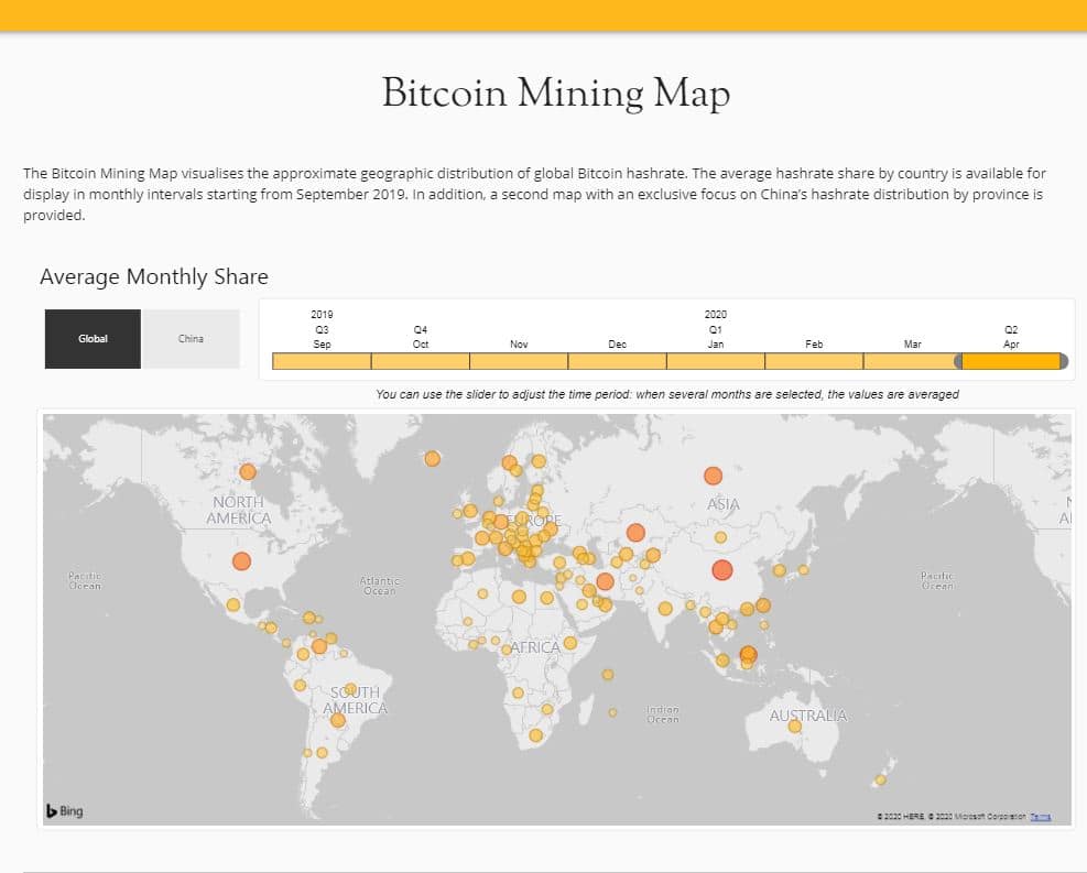 It visualizes the approximate geographic distribution of global Bitcoin hashrate. The average hashrate share by country is available for display in monthly intervals starting from Sep 2019. The second map with an exclusive focus on China’s hashrate distribution by province is provided.