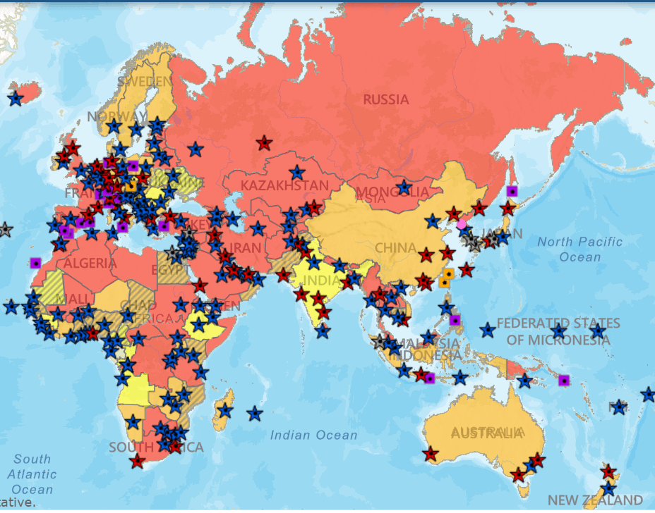 By US State Department. Shows locations of US Embassies and Consulates around the globe and travel advisory levels.